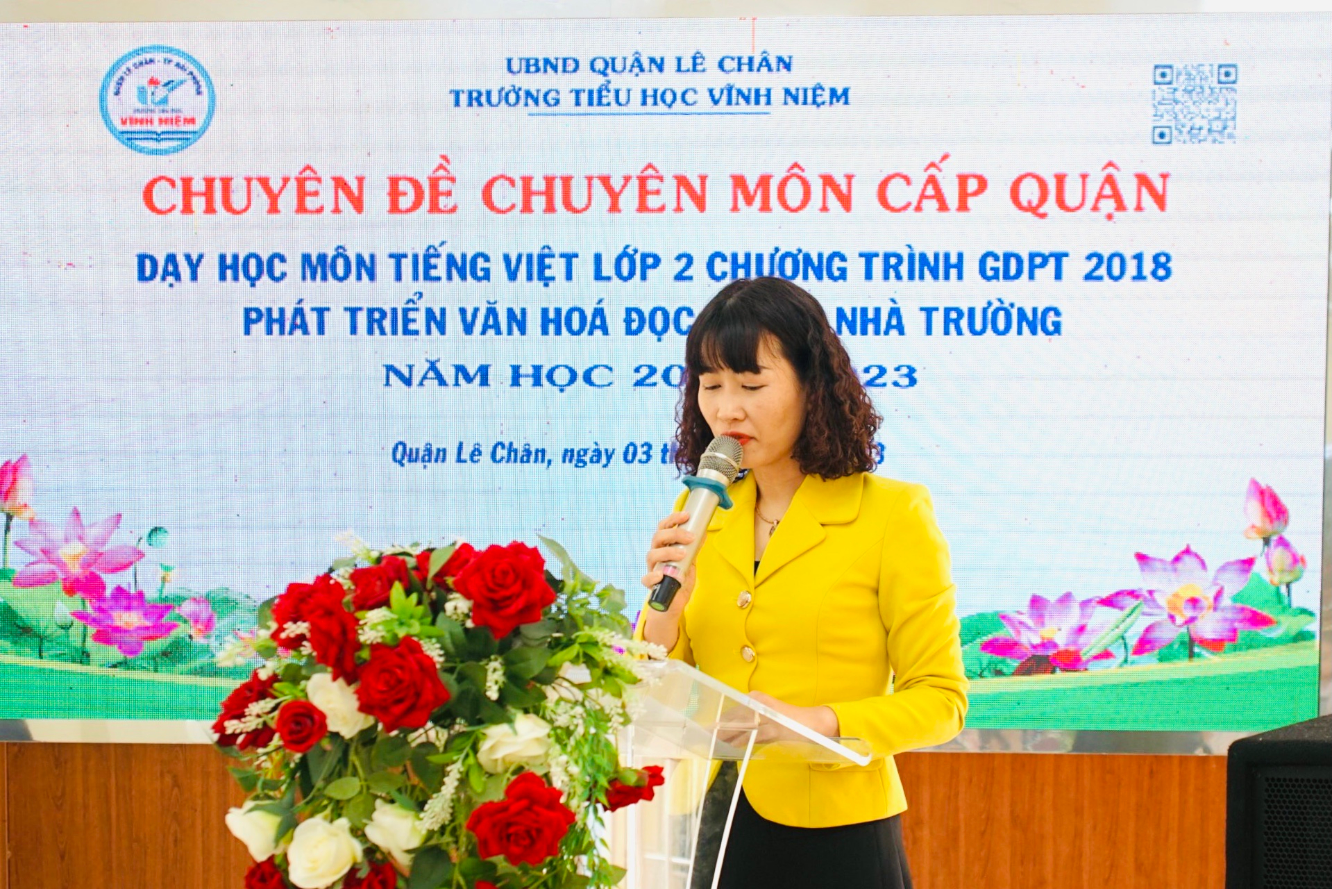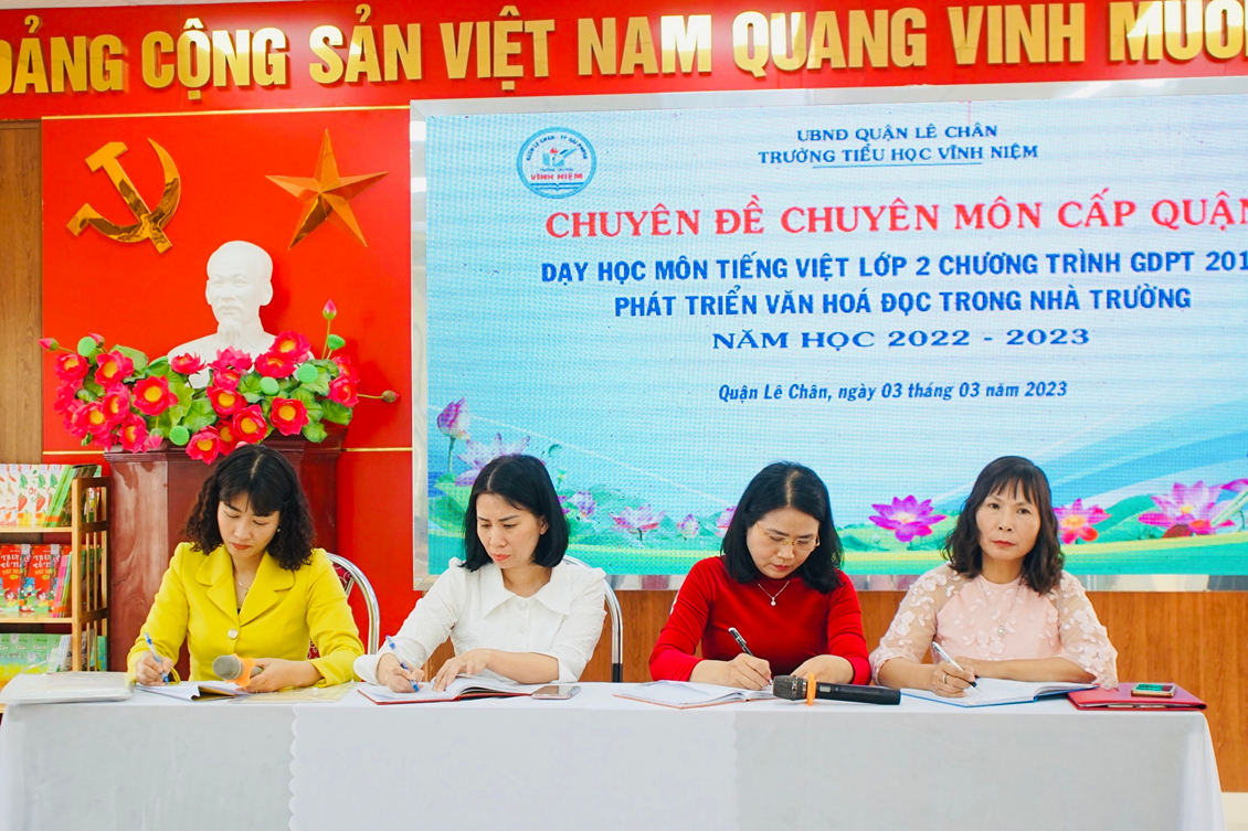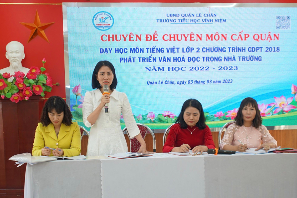 Thực hiện Công văn số 65/PGDĐT-TH ngày 16 tháng 9 năm 2022 của Phòng GD&ĐT về Hướng dẫn thực hiện nhiệm vụ Giáo dục Tiểu học Quận Lê Chân năm học 2022-2023, chiều ngày 03 tháng 3 năm 2023, Phòng GD&ĐT quận Lê Chân chỉ đạo trường Tiểu học Vĩnh Niệm đã tổ chức thành công chuyên đề chuyên môn cấp quận “Dạy học môn Tiếng Việt lớp 2 Chương trình GDPT 2018 - Phát triển văn hóa đọc trong nhà trường năm học 2022-2023 của trường Tiểu học Vĩnh Niệm.”