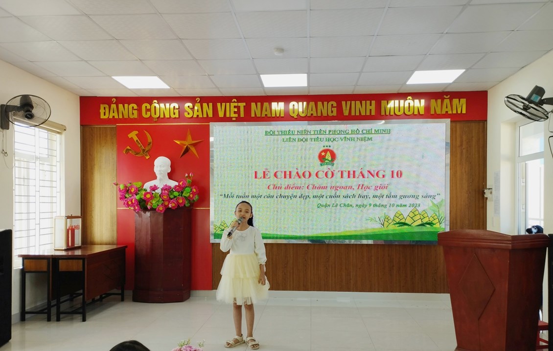 Thực hiện Chương trình công tác Đội và phong trào thiếu nhi năm học 2023 - 2024; Căn cứ kế hoạch năm học của Liên đội, sáng 09/10/2023, Liên đội trường Tiểu học Vĩnh Niệm đã tổ chức Lễ chào cờ tháng 10 với chủ điểm “Chăm ngoan, học giỏi - Mỗi tuần một câu chuyện đẹp, một cuốn sách hay, một tấm gương sáng”.