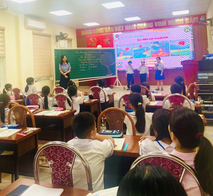 Tiết học càng thêm sinh động khi cô giáo chuyển sang phần hoạt động: “ NÓI VÀ NGHE”. Ở phần này, các em như được hóa thân vào nhân vật khi trình bày tác phẩm. Thật đáng yêu khi Ông Mặt Trời, bạn Chó Đốm đốm và người dẫn truyện đã được các bạn nhỏ lớp 3A1 tái hiện thành công với sự thể hiện thật hồn nhiên, ngôn ngữ lưu loát, truyền cảm. Tiết học diễn ra thật sôi nổi, lôi cuốn từ người học đến người dự.