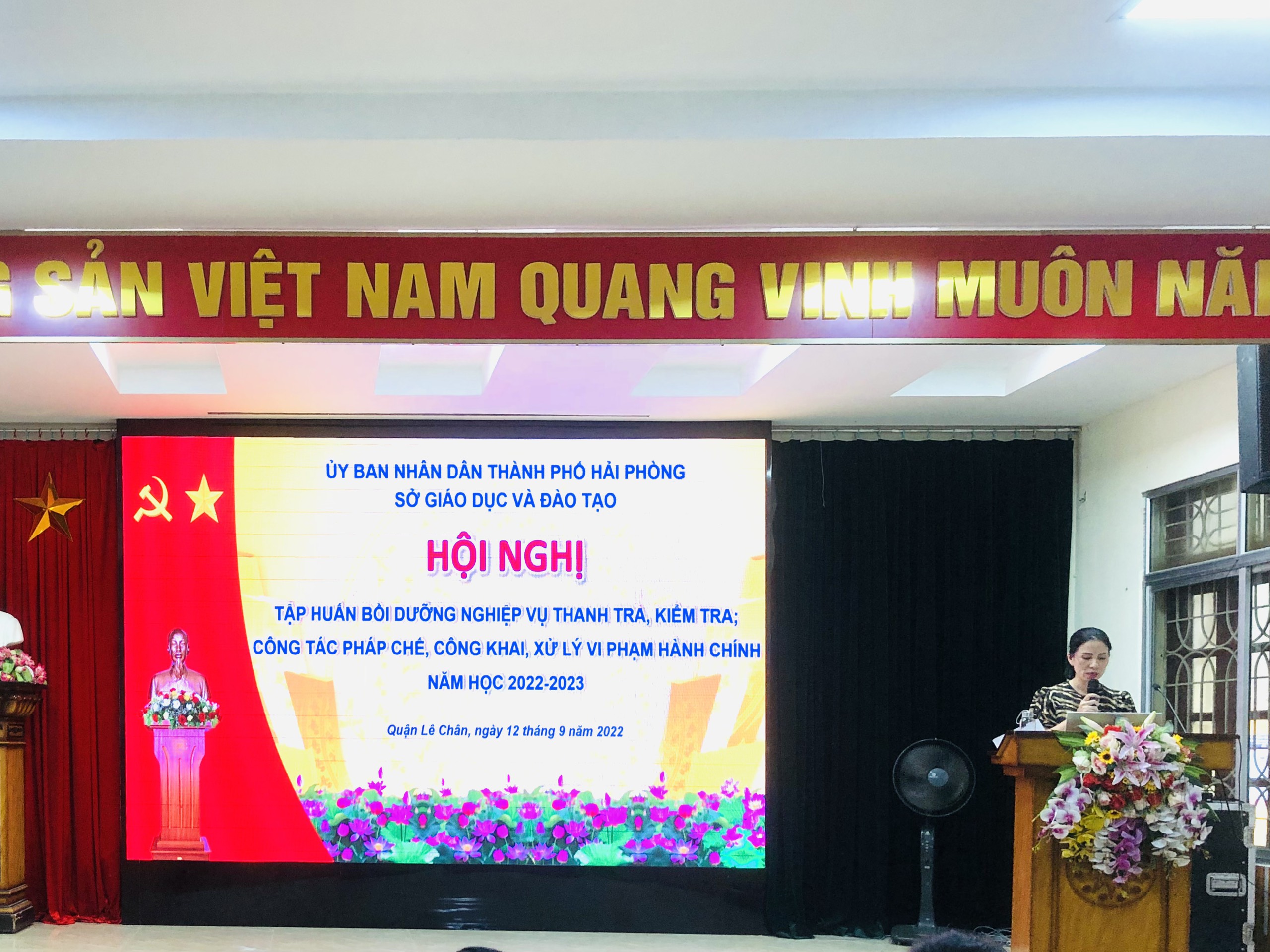 Thực hiện nhiệm vụ năm học 2022-2023, chiều ngày 12/9/2022, Sở GD&ĐT Hải Phòng tổ chức Hội nghị Tập huấn bồi dưỡng nghiệp vụ công tác thanh tra, kiểm tra; công tác pháp chế, công khai, xử lý vi phạm hành chính cho cán bộ lãnh đạo, Chủ tịch công đoàn, Trưởng Ban thanh tra nhân dân các trường MN, TH, THCS trên địa bàn quận về quản lý, triển khai công tác thanh tra, kiểm tra; công tác pháp chế, công khai, xử lý vi phạm hành chính.