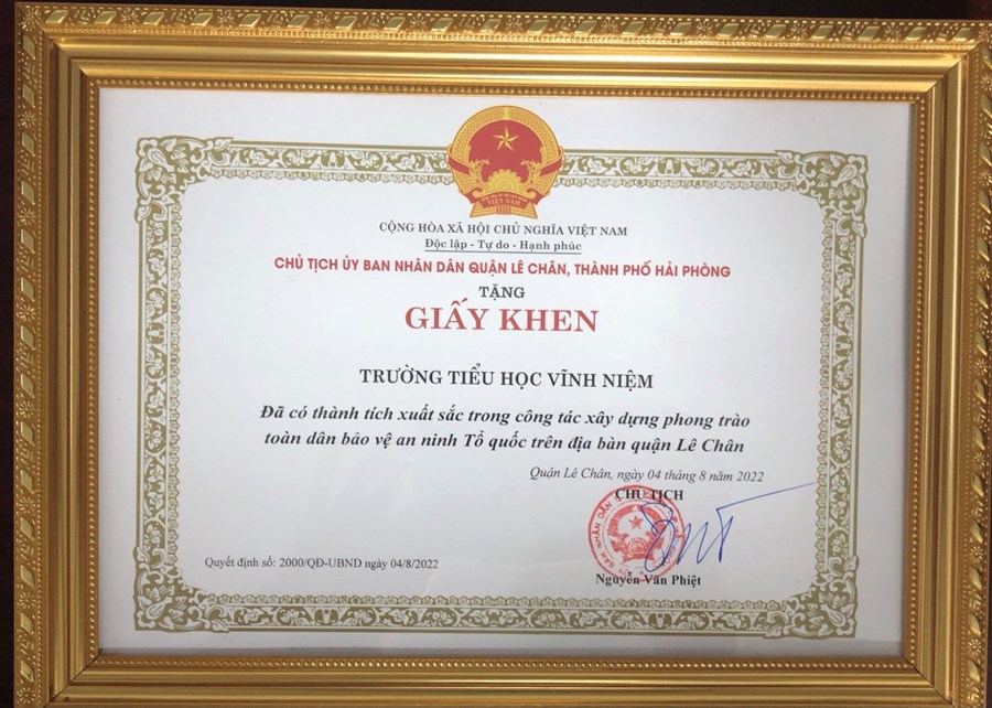Trường Tiểu học Vĩnh Niệm vinh dự được Chủ tịch UBND quận tặng Giấy khen có thành tích xuất sắc trong xây dựng phong trào Toàn dân bảo vệ an ninh Tổ quốc.
