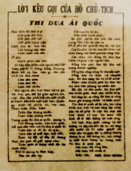 Vì bổn phận của người dân Việt Nam, bất kỳ sĩ, nông, công, thương, binh, bất kỳ làm việc gì, đều cần phải thi đua nhau: